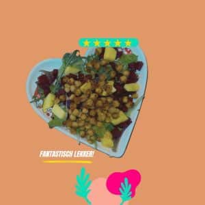 Meng ondertussen de rucola met de stukjes rode biet, kipfilet, mango en geitenkaas. Voeg de geroosterde kikkererwten toe, besprenkel met de rest van de olijfolie en breng op smaak met peper en zout.