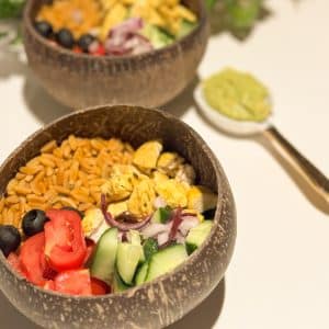 - Garneer met de overige 50 g tomaat, ⅛ rode ui, komkommerstukjes en olijfplakjes.